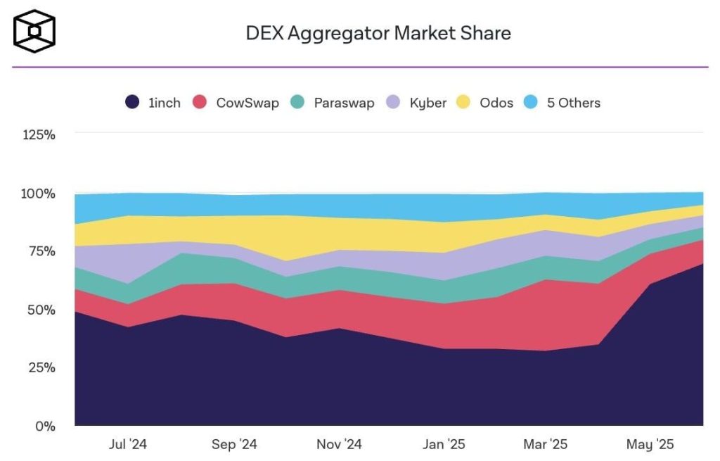 1inch ha logrado un notable regreso como líder entre los agregadores DEX, alcanzando un 60% de cuota de mercado en mayo, casi el doble respecto al 32% registrado en marzo. Este repunte coincide con su expansión estratégica a la red Solana, anunciada a finales de abril, en un intento claro de capitalizar la fiebre del trading de memecoins.