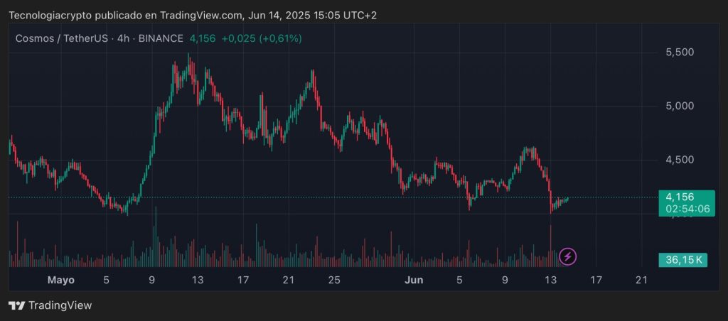 Cosmos (ATOM) registró una caída del 9 % durante las últimas 24 horas, arrastrado por la ola de ventas en el ecosistema cripto desencadenada por la intensificación del conflicto entre Israel e Irán. El precio del token se desplomó desde los 4,43 USD hasta tocar mínimos de 4,02 USD, antes de rebotar ligeramente y estabilizarse cerca de los 4,08 USD.
