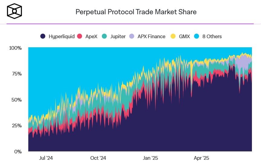 En mayo procesó $248 mil millones en volumen y, hasta la fecha, ya suma $208 mil millones solo este mes, superando ampliamente a otros exchanges on-chain de derivados que juntos llegaron a $140 mil millones.