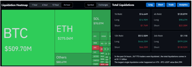 Las liquidaciones totales superaron los 1.100 millones de dólares, afectando a casi 248.000 traders. Las posiciones largas fueron las más castigadas, acumulando más de 979 millones en liquidaciones, frente a los 130,9 millones en posiciones cortas.