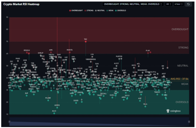 Con un RSI medio de 37,5, los analistas alertan de un aumento de la presión bajista. El mapa de calor muestra múltiples tokens en zona de sobrecompra —susceptibles de corrección— y otros en sobreventa, que podrían ver un rebote técnico en las próximas sesiones.