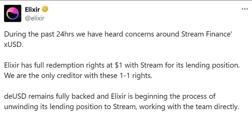Según YAM, varios fondos DeFi como MEV Capital, Varlamore y Re7 Labs también mantienen posiciones comprometidas. Elixir afirmó tener derechos contractuales de redención a $1 por deUSD, aunque Stream Finance habría indicado que los reembolsos permanecen suspendidos hasta que los abogados determinen la distribución de responsabilidades.