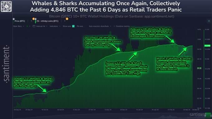 Según el último informe de Santiment, los grandes poseedores de Bitcoin, conocidos como ballenas (más de 1,000 BTC) y tiburones (100-1,000 BTC), han acumulado más de $381 millones en BTC en seis días. Esta actividad se produce en un momento de alta volatilidad y caída de precios, lo que sugiere que estos actores ven la baja como una oportunidad de compra.