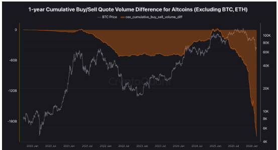 El diferencial acumulado entre compras y ventas en altcoins alcanzó -209.000 millones de dólares, reflejando ausencia sostenida de compradores en el mercado spot.