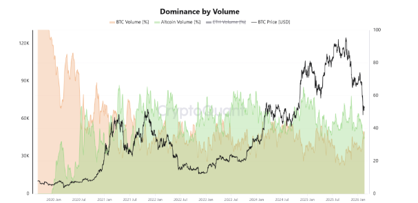 En Binance, el volumen de negociación de altcoins cayó aproximadamente un 50% desde noviembre de 2025. Paralelamente, la cuota de volumen de Bitcoin en el exchange aumentó hasta el 36,8% a comienzos de febrero, mientras las altcoins descendieron desde el 59,2% hasta el 33,6%.