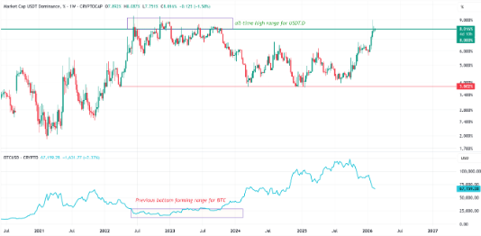 La dominancia de Tether (USDT) alcanzó el 8%, nivel similar al visto entre 2022 y 2023 durante zonas de mercado bajista.