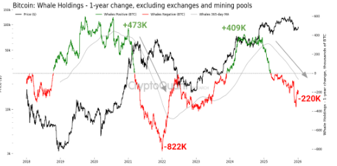 Los datos on-chain muestran que las Bitcoin ballenas han retomado la acumulación tras finalizar la fase de venta más rápida desde comienzos de 2023. Según métricas de CryptoQuant, las direcciones que poseen entre 1.000 y 10.000 BTC añadieron 46.000 BTC esta semana, llevando el cambio neto anual a terreno positivo por primera vez desde el cuarto trimestre de 2025.