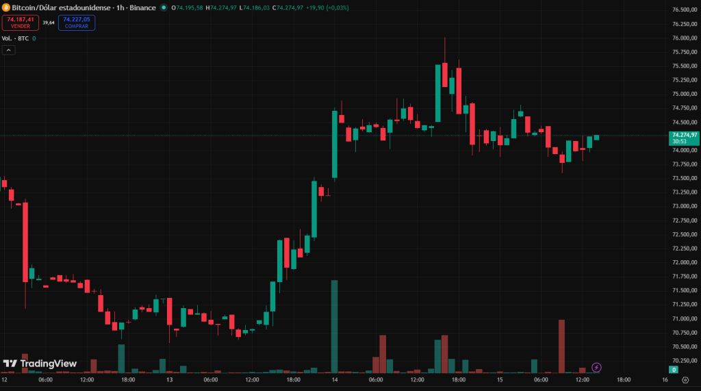Bitcoin ha retrocedido tras tocar los $75.000, confirmando este nivel como una resistencia clave en el corto plazo.