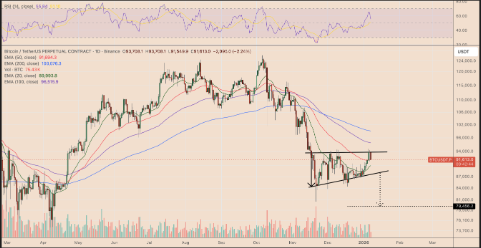 Aunque el precio se mantiene cerca de la EMA de 50 días (~91.700$), la pérdida sostenida de ese nivel abre la puerta a un retroceso hacia 88.000–89.000$, zona alineada con la EMA de 20 días y el soporte del patrón.