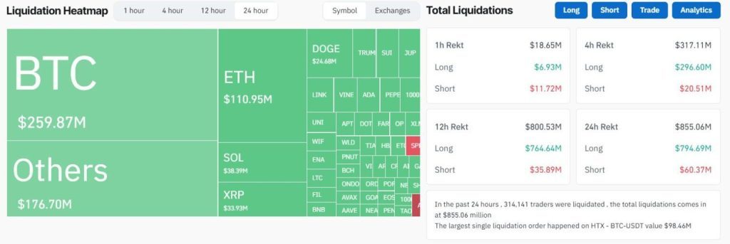 La caída de Bitcoin por debajo del umbral de los $100,000 provocó un colapso masivo en el mercado cripto, con $855 mil millones en liquidaciones. Este movimiento estuvo influenciado por un shock del mercado vinculado a DeepSeek AI, generando pánico entre los inversores.