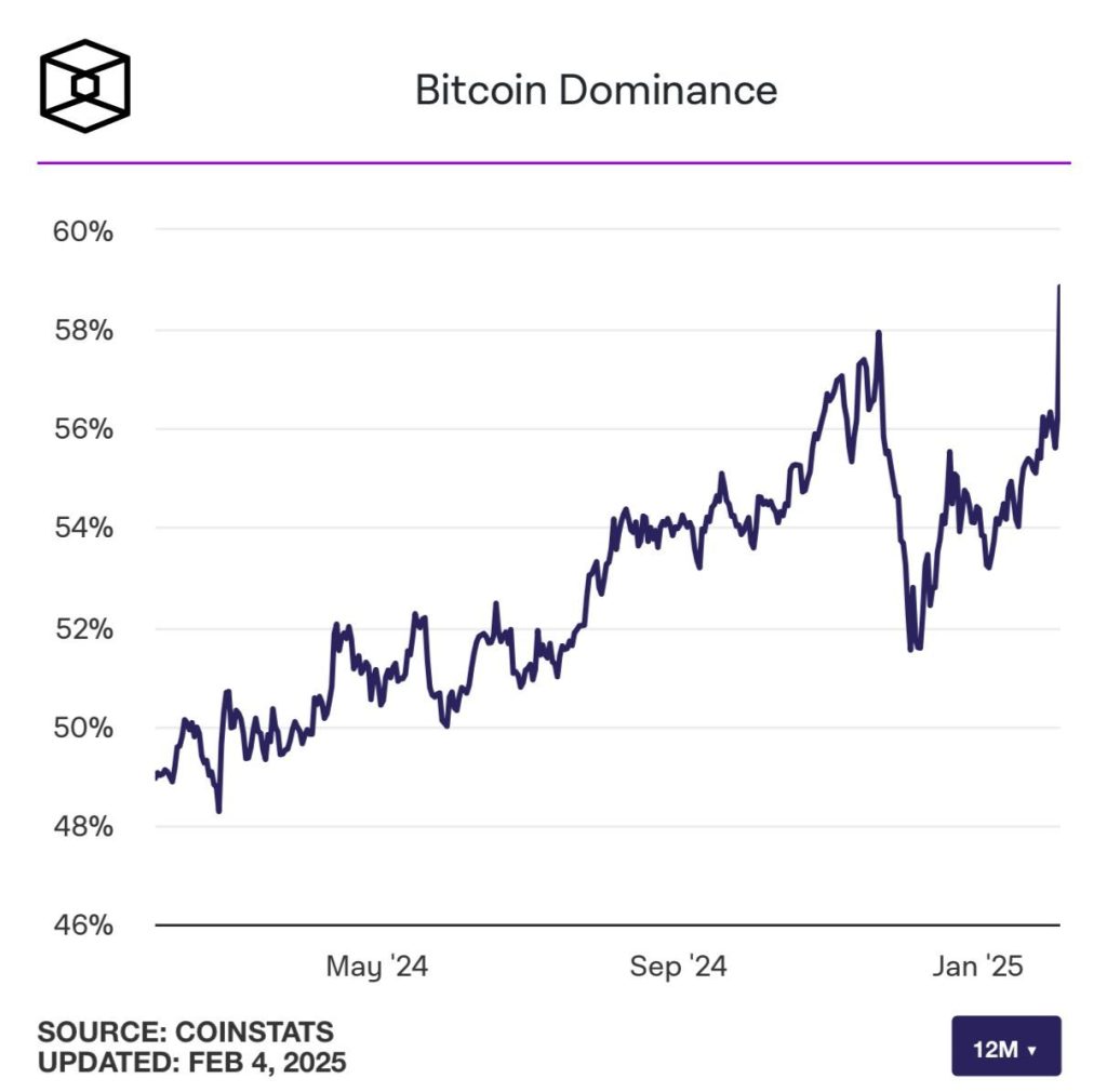La dominancia de Bitcoin ha alcanzado un 58% en el mercado de criptomonedas, lo que indica un desplazamiento de capital desde las altcoins hacia la criptomoneda líder. Esta cifra representa uno de los niveles más altos de dominio de BTC en los últimos años y refleja la creciente preferencia de los inversores por activos más seguros en tiempos de incertidumbre. Claramente, el dominio de Bitcoin en el mercado cripto está en aumento.