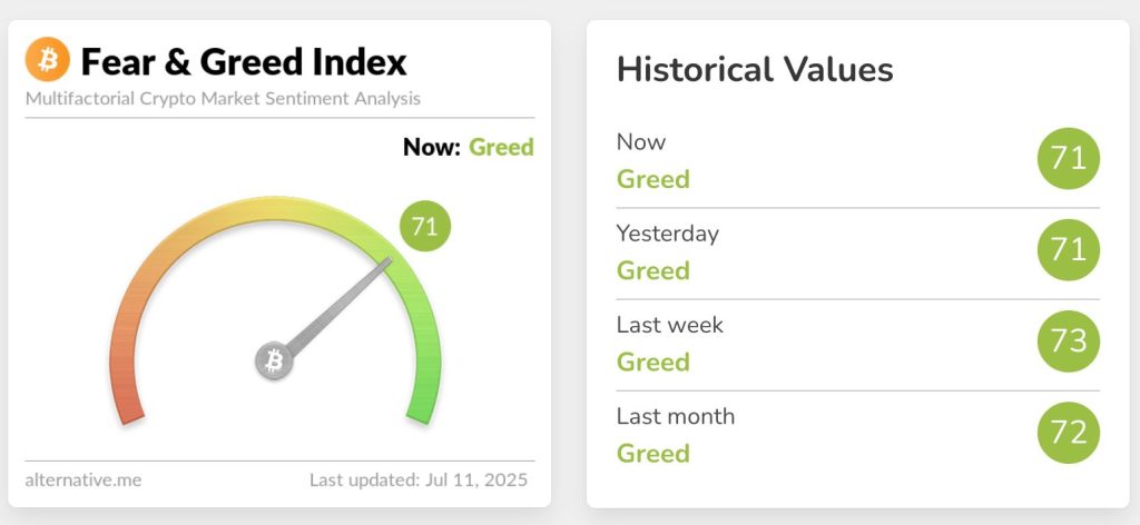 El índice Crypto Fear & Greed se mantuvo estable en zona de “codicia” con 71 puntos, mostrando que el sentimiento de mercado sigue siendo optimista pese a la fuerte volatilidad.