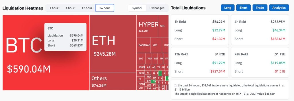 Según datos de CoinGlass, más de 1.010 millones de dólares en posiciones cortas fueron liquidadas en las últimas 24 horas, afectando a más de 232.000 traders.
