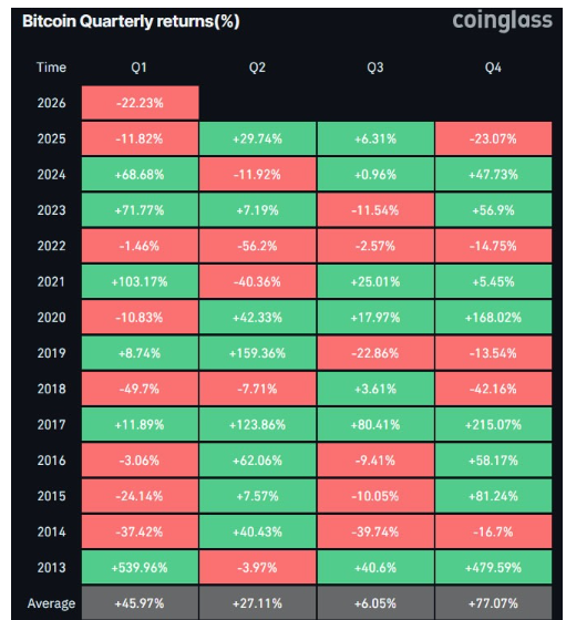 Históricamente, Bitcoin ha registrado pérdidas en siete de los últimos trece primeros trimestres. Sin embargo, los analistas recuerdan que el comportamiento del primer trimestre no suele marcar necesariamente la tendencia del resto del año.