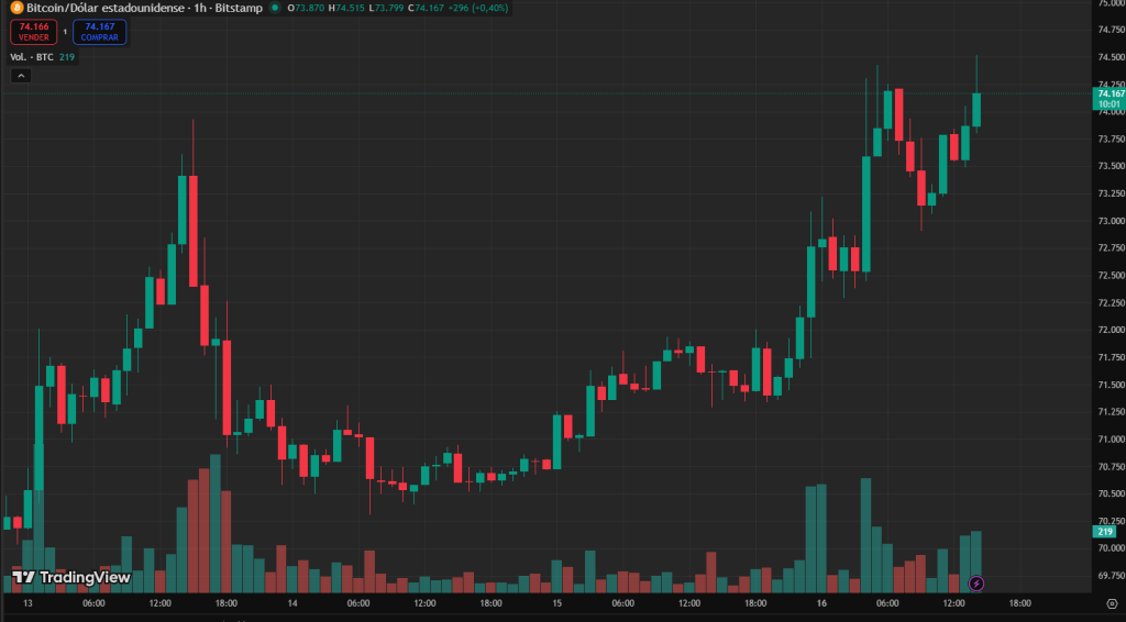El 16 de marzo de 2026, el precio de Bitcoin alcanzó los $73.882, lo que representa un aumento de $2.327 en las últimas 24 horas, equivalente a una subida aproximada del 3,25%.