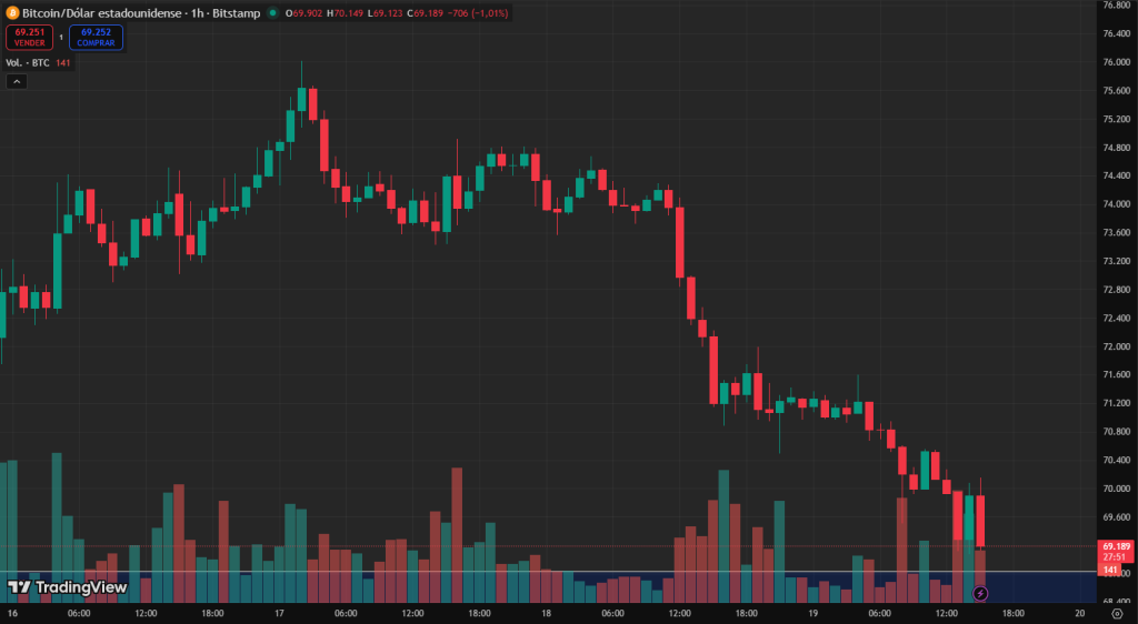 Bitcoin cotiza en torno a $69.370, tras una caída diaria del 4,29%.