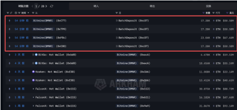 Datos onchain de Arkham muestran que varias wallets vinculadas a Bitmine enviaron 74.880 ETH al contrato “BatchDeposit”, un patrón habitual en configuraciones institucionales que agregan fondos antes de crear validadores.