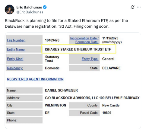 En paralelo, BlackRock ha registrado en Delaware un nuevo ETF de Ethereum con staking, lo que añade un desafío directo a las DATs.