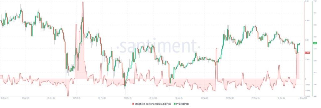 Los datos on-chain de Santiment revelan que el Sentimiento Ponderado en torno a BNB ha subido a 2.24, lo que sugiere una percepción positiva generalizada en redes sociales. Esto podría desencadenar mayor demanda y sostener la tendencia alcista.