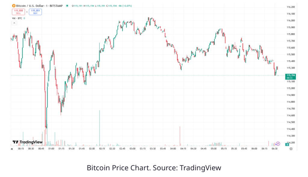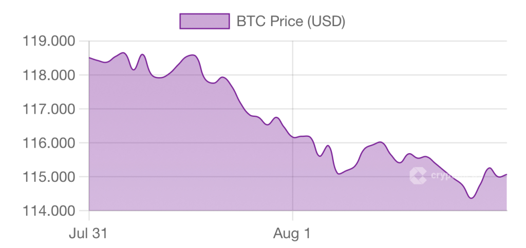 Bitcoin cayó a $115,555 (-2.3%), mientras Ethereum se redujo a $3,673 (-4.8%).