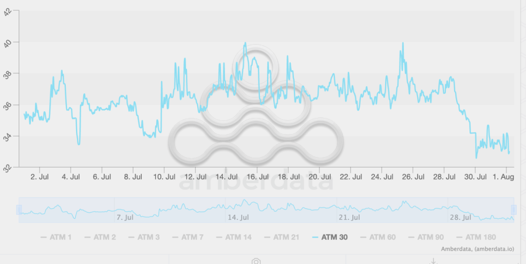 La volatilidad de 30 días de BTC se redujo de 36% a 34% en julio, señalando una posible ruptura direccional.