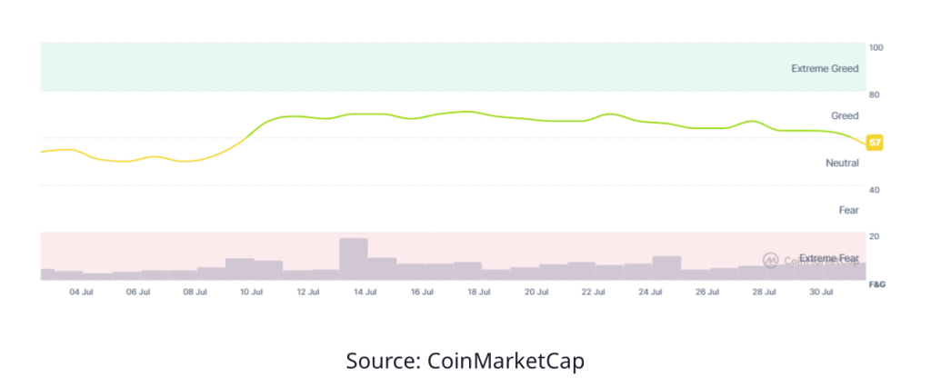 El índice de miedo y codicia bajó a 57 (neutral) desde 62, sugiriendo que el sentimiento de mercado se está debilitando, aunque aún no entra en zona de miedo.