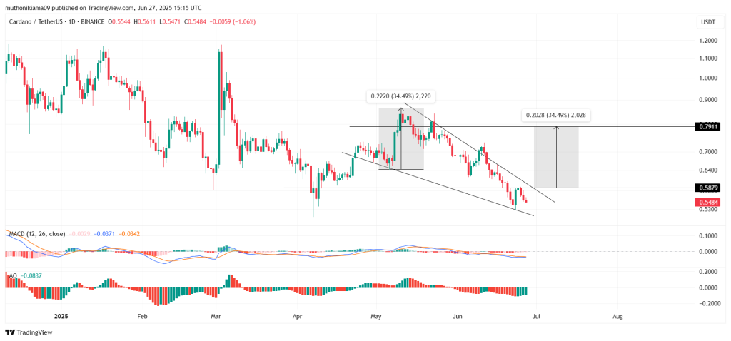 ADA ha estado formando un patrón de cuña descendente durante casi dos meses, caracterizado por máximos y mínimos más bajos. Este patrón suele indicar una pérdida de presión vendedora y una acumulación que precede a un repunte alcista.
