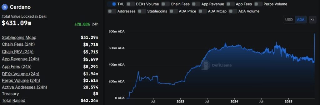 La red de Cardano registró un aumento explosivo en su Total Value Locked (TVL), que pasó de 253 millones a 431 millones de dólares en solo 24 horas, según datos de DeFiLlama. Esta es la cifra más alta registrada desde marzo y refleja un fuerte crecimiento de la actividad DeFi.