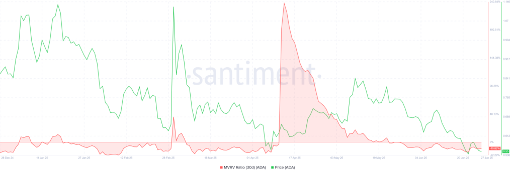 El ratio Market Value to Realized Value (MVRV) a 30 días se sitúa en -10,82%, lo que históricamente ha sido señal de zonas de compra. En ocasiones anteriores, como en febrero y abril de 2025, caídas similares del MVRV precedieron repuntes significativos en el precio de ADA.