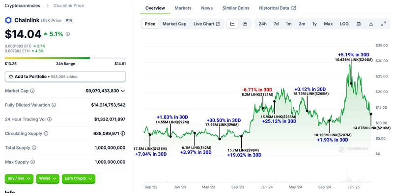 A pesar del volumen de tokens liberados, el impacto inmediato en el precio de LINK ha sido limitado. Actualmente, el activo se cotiza a $14.02, lo que representa una caída del 73% desde su máximo histórico.