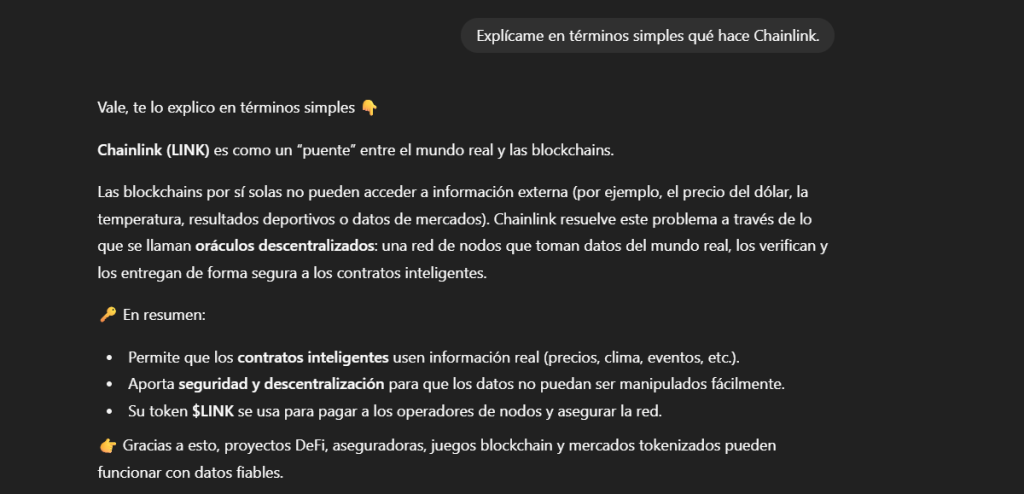 👉 Ejemplo prompt: “Explícame en términos simples qué hace Chainlink.”