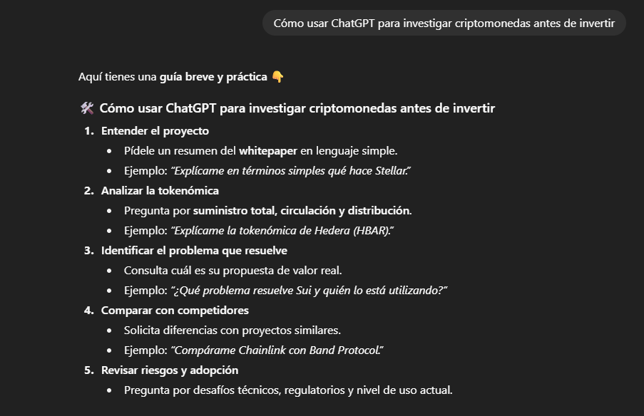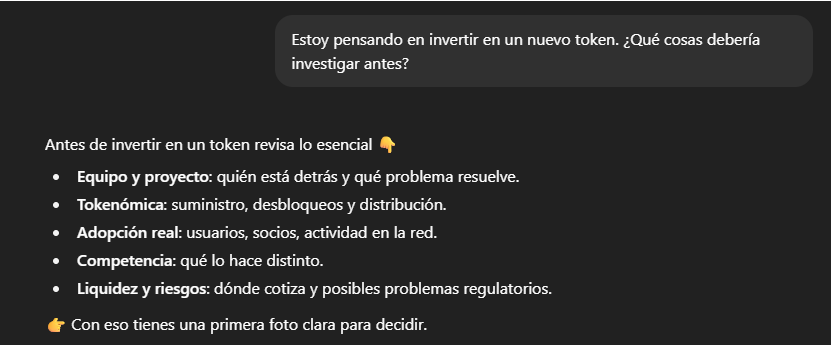 👉 “Estoy pensando en invertir en un nuevo token. ¿Qué cosas debería investigar antes?”