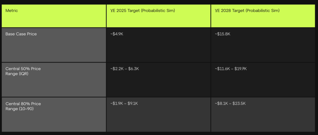 Bajo este modelo, la empresa proyecta que ETH podría alcanzar los USD 4.900 en 2025 y hasta USD 15.800 para 2028, suponiendo un crecimiento modesto en monedas estables, activos del mundo real tokenizados (RWA) y valor total bloqueado (TVL).