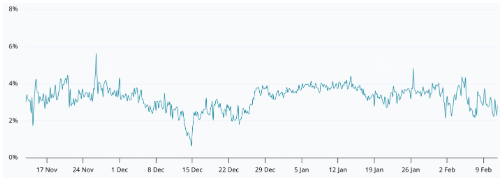 La prima anualizada de futuros a dos meses se mantiene alrededor del 3%, por debajo del umbral neutral del 5%.