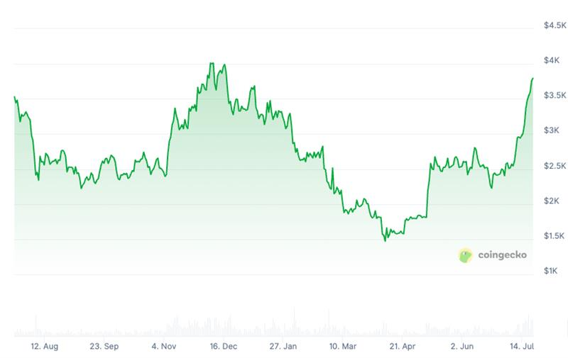 Según CoinShares, estas últimas cifras representan el 23% del total del AUM de Ethereum. La subida vino acompañada por un repunte del precio de ETH, que superó los $3.500, su nivel más alto desde enero.