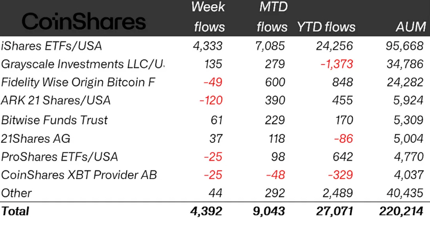 Otros emisores como Fidelity y ProShares experimentaron salidas menores de $49 millones y $25 millones, respectivamente. En Europa, CoinShares también reportó salidas por $25 millones, sumadas a los $18 millones de la semana anterior.