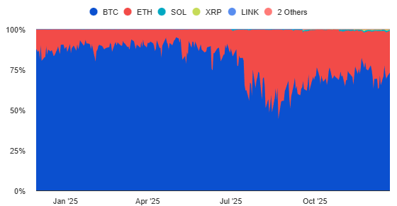 A pesar del lanzamiento de múltiples productos alternativos, el capital institucional continuó concentrándose mayoritariamente en Bitcoin, utilizando los ETF como principal vía de exposición al mercado cripto.