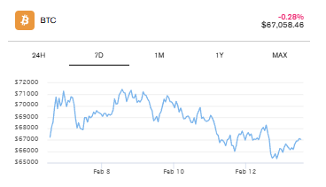Actualmente, Bitcoin cotiza alrededor de USD 67.000, con una caída moderada en las últimas 24 horas y sin señales claras de ruptura alcista.