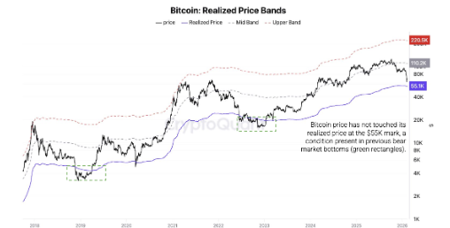 La firma CryptoQuant sitúa el soporte realizado en torno a USD 55.000, aunque señala que el mercado aún no ha entrado en una fase de “bajismo extremo”, condición que históricamente ha precedido los suelos definitivos.