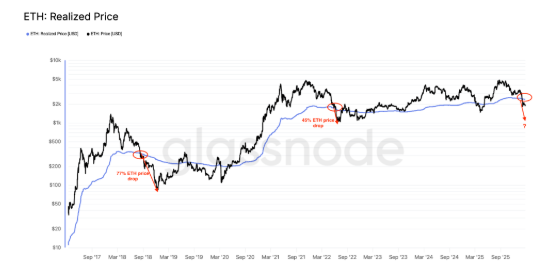 El precio actual se sitúa por debajo del realized price (≈$2.380), un indicador que refleja el coste promedio al que los ETH fueron movidos por última vez.