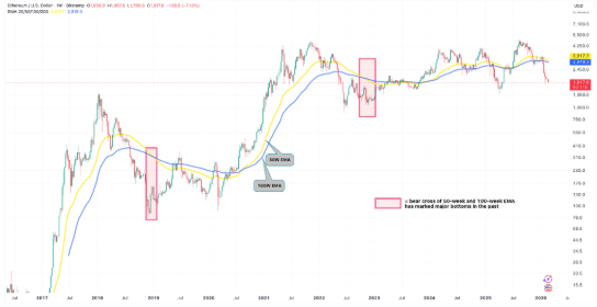El cruce bajista entre la media exponencial de 50 semanas y la de 100 semanas aún no se ha completado. En ciclos anteriores, el suelo macro no se confirmó hasta después de ese cruce.