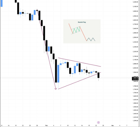 Además, analistas identifican una estructura de bear flag en gráfico diario, con objetivos técnicos en el rango $1.400–$1.500 si continúa la presión.