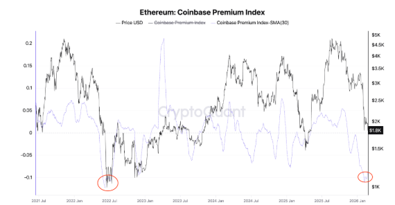 El índice Coinbase Premium se mantiene en terreno negativo cercano a mínimos de 2022, lo que indica venta dominante desde EE.UU.
