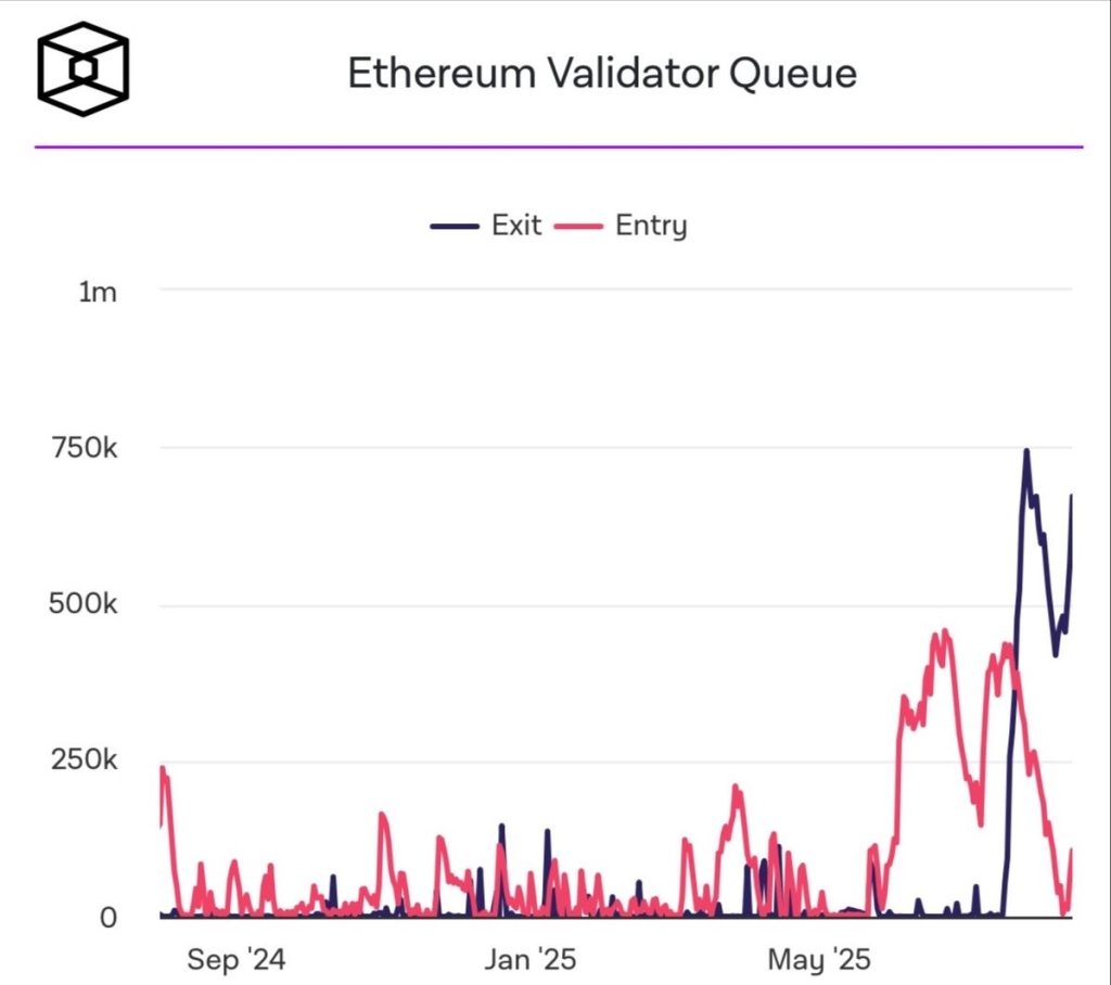 La cola de salida de validadores de Ethereum alcanzó 671.900 ETH, equivalentes a $3.100 millones, según datos de The Block. Esto ocurre tras varias semanas de incremento sostenido en los retiros, que ya habían superado los 521.000 ETH a mediados de julio.