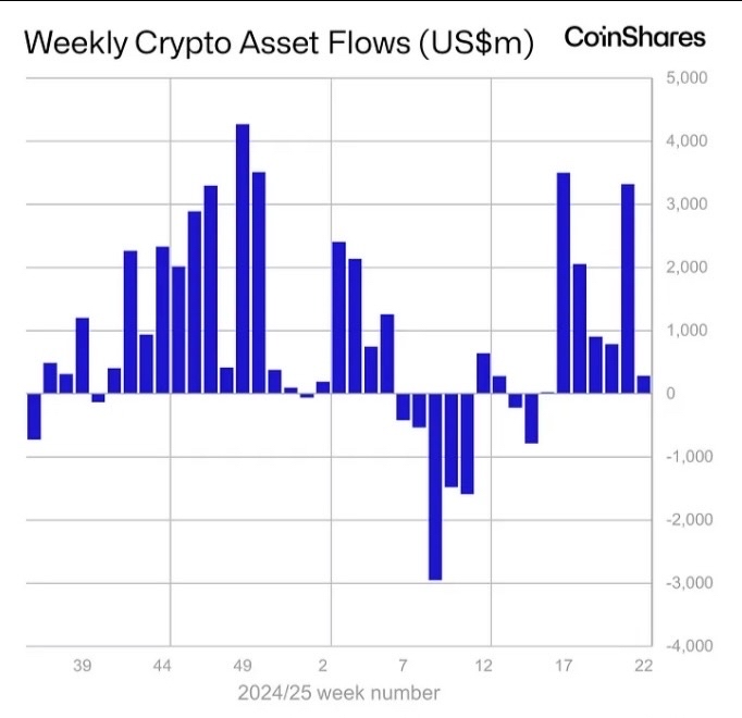 Los productos de inversión en criptomonedas registraron la séptima semana consecutiva de entradas netas, con un total de $286 millones, impulsados por el mejor desempeño semanal de Ethereum desde diciembre de 2024, según el último informe de CoinShares.