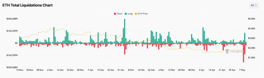 El mercado de futuros de Ethereum ha sido otro catalizador clave. Desde el 8 de mayo, se han liquidado más de $437.94 millones en posiciones cortas (apostando a la baja), obligando a los vendedores a recomprar ETH para cubrir pérdidas, lo que ha intensificado la presión alcista. Simultáneamente, se registraron $211.29 millones en liquidaciones de posiciones largas.