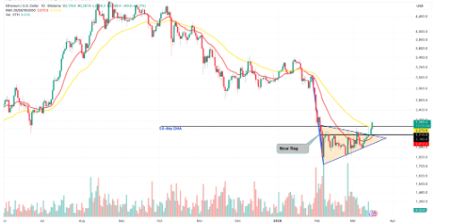 Durante el fin de semana, ETH invalidó un patrón bajista conocido como bear pennant, después de romper la línea de tendencia superior cerca de $2.100. La ruptura vino acompañada de un aumento en el volumen de negociación, lo que sugiere una mayor convicción en el movimiento alcista.