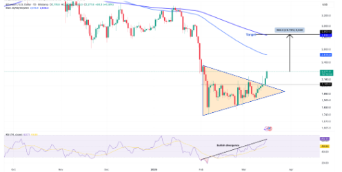En el caso de Ethereum, la ruptura alcista proyecta un movimiento potencial hacia $2.850, lo que implicaría un aumento cercano al 26% desde los niveles actuales.