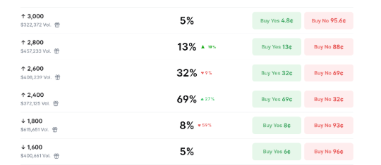 Mientras tanto, las probabilidades de que ETH caiga hacia $1.800 o $1.600 han disminuido, lo que indica una reducción en las expectativas bajistas.