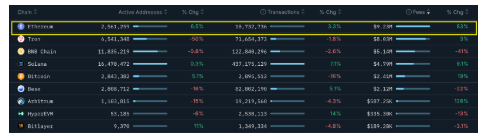 Mientras tanto, otras blockchains mostraron una dinámica opuesta: Solana solo subió un 9,1 % y BNB Chain registró una caída del 41 % en ingresos.